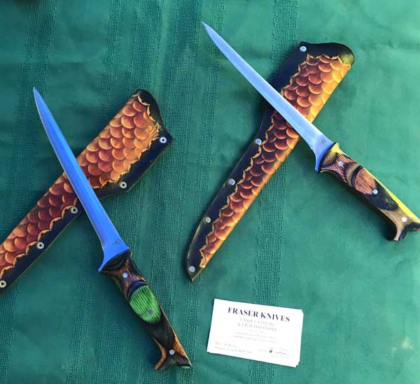 Most knives he makes are one of a kind due to blade shape and handle material – beautiful, while retaining their intended use. Rare woods such as ebony, cocobolo, rosewood, as well as mastodon ivory and pearl, are selected to totally personalize and add to the uniqueness of each piece.